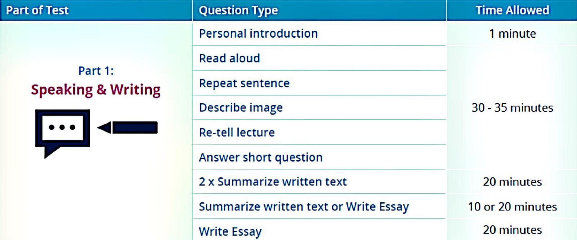 In Part 1 you will be tested on your speaking and writing skills. The time given to this section is 77-93 minutes. To assess speaking, your skills will be tested by your ability to produce spoken English in an academic environment. The writing section will require you to write responses in academic English using correct grammar and spelling.