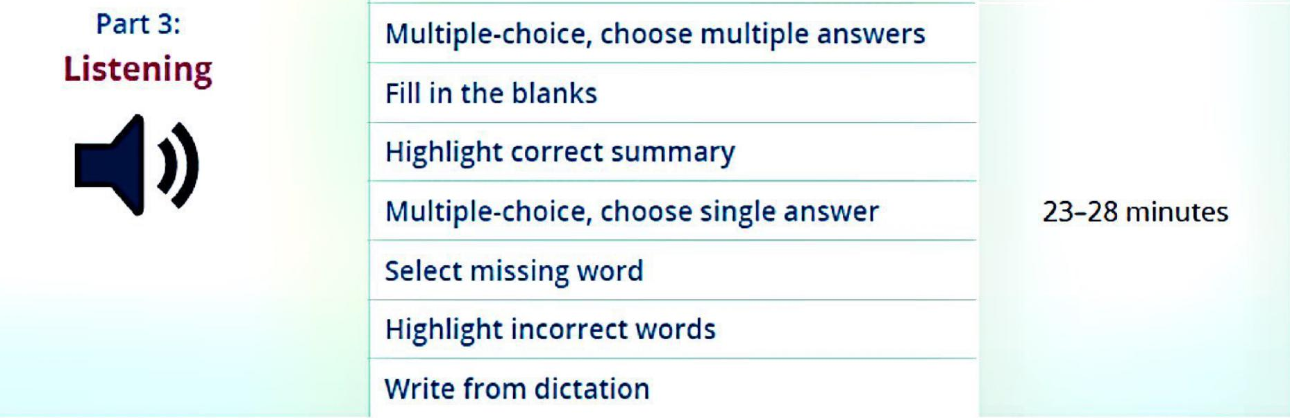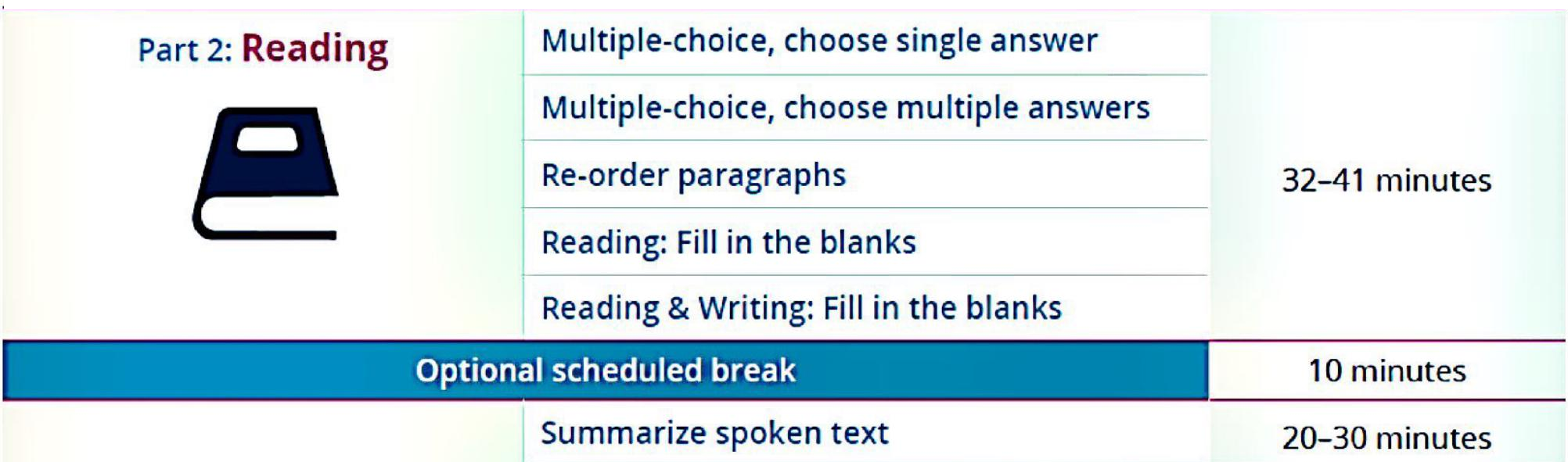 In part 2 you will be tested on your reading skills. This single timed section contains 15-20 independent and integrated skills items, depending on the combination of items in a given test. Different response formats, including multiple-choice, re-order paragraphs, and fill in the blanks, are designed to test your ability to read, write and listen to information provided in English. Because PTE Academic is an integrated skill test, one item type in this part of the test also assesses writing skills.